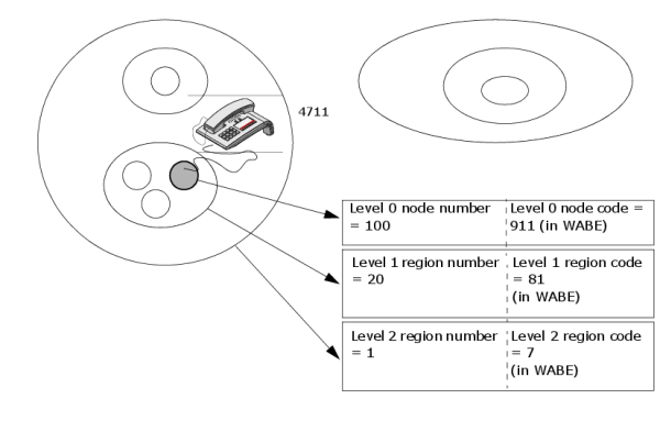 In Figure 12 for example the shaded node has the number 1-20-100. Region/node codes are part of the station number in open numbered networks. The station in Figure 12 connected to node 1‑20‑100 has the phone number 7-81-911-4711.