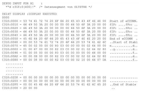 in dieser Ausgabe kann der Anwender 4 Zeichenketten erkennen, von denen “Start of eCCONN“ und “End of eCCONN “ die Tabelle in Abschnitt , “Start of Stable“ und “End of Stable “ die Tabelle in Abschnitt umrahmen.