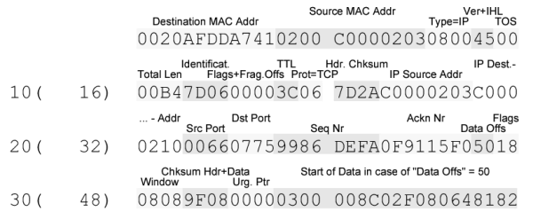 Wie bereits am Anfang des Abschnitt  auf Seite 2463 angemerkt wurde, müssen die Tracepunkte ETHSD und ETHRV verwendet werden, falls die Protokoll Daten benötigt werden. Die Struktur der Trace Daten entspricht denen von den Tracepunkten ETHSD und ETHRV. Diese Struktur - für TCP Kommunikation - wird in Bild  dargestellt und kurz kommentiert. Für nähere Details und andere Protokolle schauen Sie bitte in RFC791(IP), RFC792(ICMP), RFC793(TCP) und RFC826(ARP) nach.