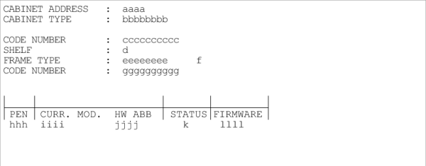 This AMO is used to output the cabinet configuration of a system - cabinet data, module frame data, and data of the SWU-CC modules - in the form of a table or position-oriented commands for compiling a diagram by means of a PC program.