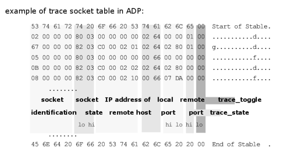 The only task of this table is to simplify the selection of TCP sockets/connections for protocolling.Therefore TCP enters every two seconds all valid sockets or connections respectively in the table and shows their state as well as their trace-option. By means of the last column of this table the user can switch over connection specifically the trace option by setting the "trace_toggle" byte to a value unequal 0. In case of the next update of this table TCP checks the "trace_toggle" column and switches over the trace option (ON->OFF resp. OFF->ON; ON=01,OFF=00). Then TCP sets the "trace_toggle" byte again to 00.